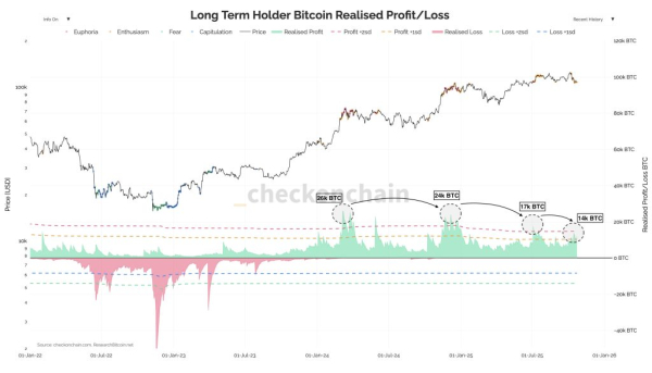 «После пика в 14 000 BTC по реализованной прибыли долгосрочные держатели по-прежнему фиксируют сегодня около 12 000 BTC — показатель остается на высоком уровне».