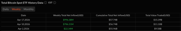 - Биткойн-ETF привлекли 996,38 млн долларов в период с 13 по 17 апреля, причем лидером стал IBIT от Blackrock с притоком средств в размере 906,1 млн долларов.