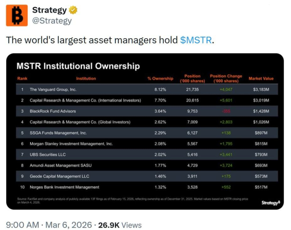 Strategy (Nasdaq: MSTR), крупнейший корпоративный держатель биткойнов, 6 марта сообщила в социальной сети X, что некоторые из крупнейших в мире управляющих активами держат позиции в ее акциях, подчеркнув масштаб институционального владения, связанного с компанией.