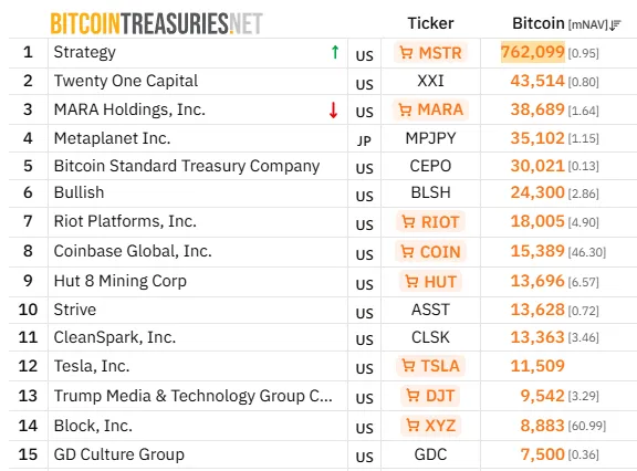 Казначейская фирма Twenty One Capital поднялась на второе место с 43 514 BTC. Первую строчку по-прежнему занимает Strategy — 762 099 BTC.