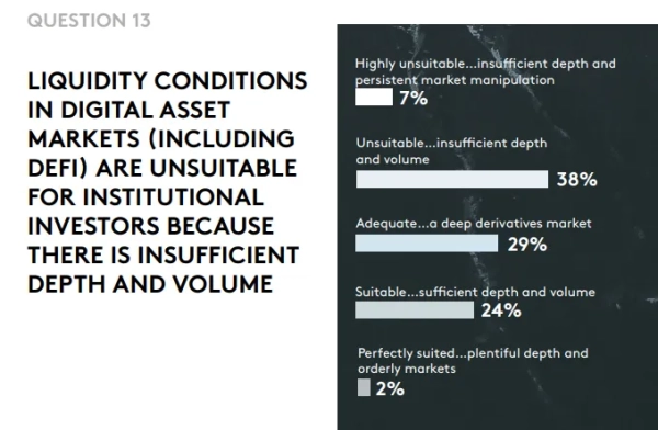 Около 84% участников оценили макроэкономические условия как благоприятные для развития криптоиндустрии. Однако они подчеркнули: текущая рыночная инфраструктура еще не готова к масштабированию под действительно крупные объемы капитала.
