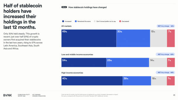 За последние 12 месяцев половина владельцев стейблкоинов увеличила свои накопления. Еще 56% планируют докупить в ближайший год, а 13% тех, кто пока не покупал стейблкоины, намерены начать. Интерес особенно высок в странах с низкими и средними доходами: там впервые приобрести стейблкоины собираются вдвое чаще, чем в богатых экономиках. Лидирует Африка — 79% респондентов там уже держат стейблкоины, а объем накоплений за год вырос на 73%.