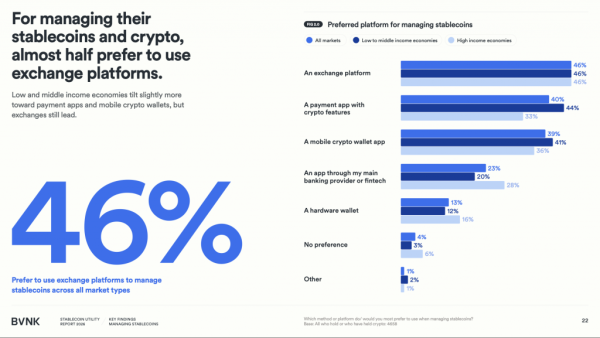 Вопреки образу децентрализованных финансов, основным инструментом остаются централизованные биржи: 34% покупают стейблкоины именно там, 28% — через криптовалютные кошельки, 17% — через брокеров. При управлении активами биржевые платформы предпочитают 46% пользователей вне зависимости от региона.
