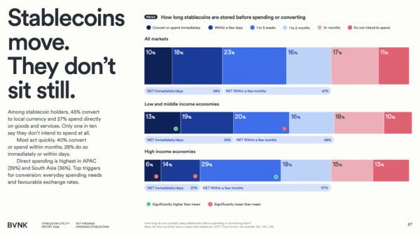 Скорость обращения существенно варьируется по регионам. В Южной Азии 45% пользователей конвертируют стейблкоины немедленно или в течение нескольких дней, в Латинской Америке — 32%, тогда как в Европе этот показатель составляет лишь 17%. Прямые траты наиболее высоки в Азиатско-Тихоокеанском регионе (39%) и Южной Азии (36%).
