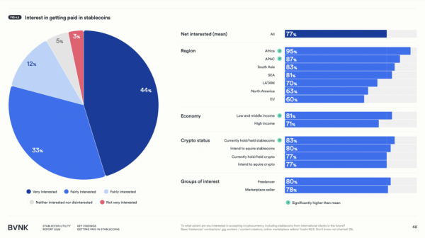 Для фрилансеров, работников гиг-экономики и продавцов на маркетплейсах стейблкоины составляют около трети годового дохода — в среднем 35%. Это не дополнительный заработок, а основная выручка. Три четверти фрилансеров (73%) заявили, что стейблкоины расширили их возможности работать с зарубежными клиентами, причем 46% оценивают улучшение как значительное. Среди продавцов на маркетплейсах 76% фиксируют рост объема продаж или расширение клиентской базы после подключения криптоплатежей.