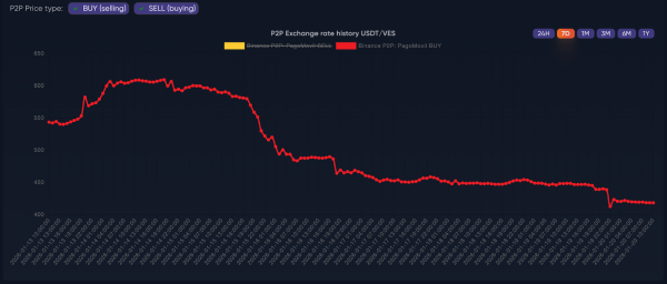 Курс USDT на р2р-рынке Binance резко упал за две недели. Во время спада котировки ненадолго опустились с примерно 800 боливаров за один стейблкоин до 500 боливаров.