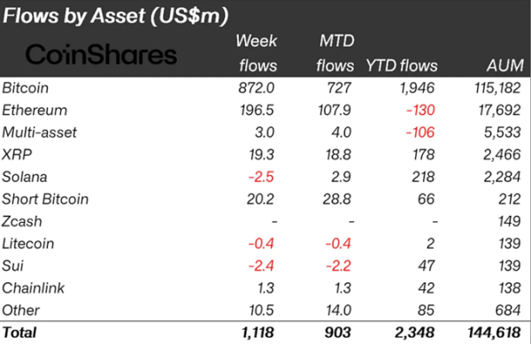 Приток в фонды на основе биткоина (BTC) составил $871 млн. Показатель с начала года повысился до $1,95 млрд.
