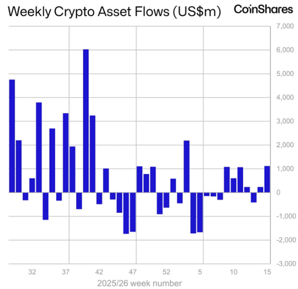 С 4 по 10 апреля приток в биржевые продукты (ETP) на основе криптовалют составил максимальные с января $1,12 млрд против $224 млн неделей ранее. Такие данные привели в CoinShares.