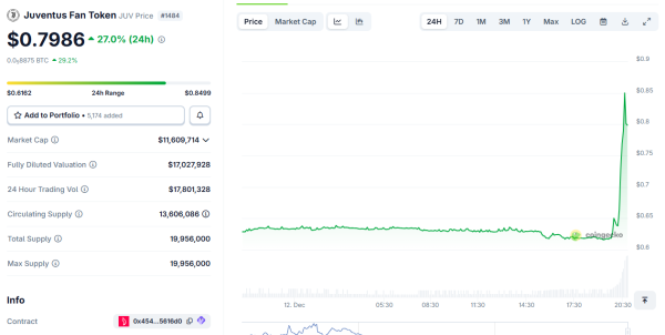 Курс фанатского токена JUV резко вырос после объявления Tether. Источник: CoinGecko