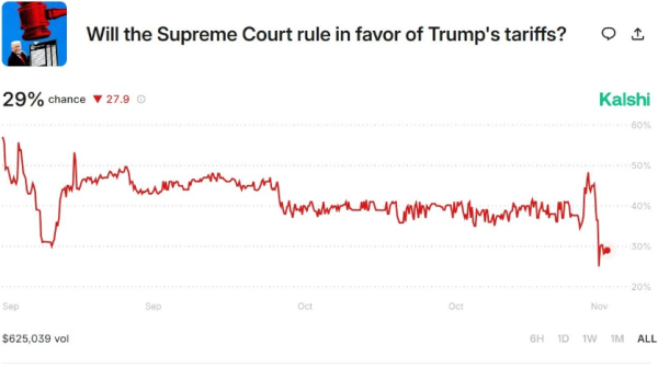 Так, регулируемая в Соединённых Штатах платформа Kalshi сообщила, что Верховный суд встанет на сторону Трампа в 29%, что на 28 пунктов меньше, чем днём ранее. На конкурирующей платформе Polymarket этот показатель тоже снизился до 25%.