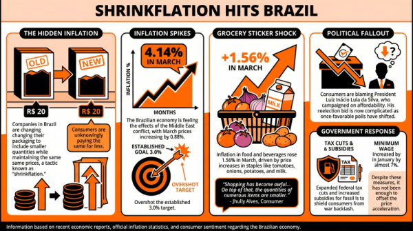 «Шринкфляция» — явление, при котором товары поставляются в меньших объемах, но продаются по прежним ценам, — начинает сказываться на бразильской экономике, поскольку инфляция ухудшилась из-за продолжающегося конфликта на Ближнем Востоке.